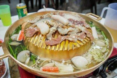 火锅和烤肉的完美结合,一个圆顶烤架的下面放上一个汤锅,在炭火上烤,就成了泰式火锅。源于泰国人想要同时吃烤肉和日式火锅,于是乎嗅觉灵敏的商人就想出了这个一举两得的好法子。它的盛传更来自于成功的宣传。
