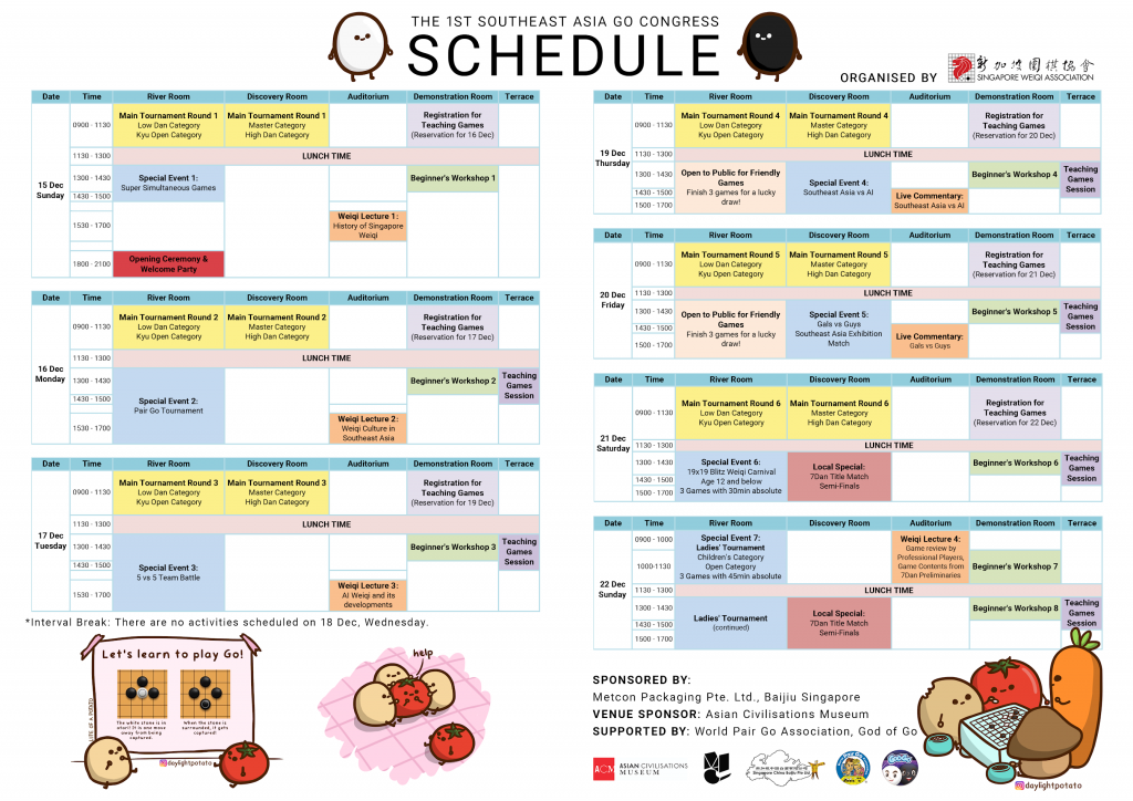 本次东南亚围棋大会的活动形式繁多,不仅有奖金超高的大师赛和高段组赛,还有面向初学者的低段组和级位组比赛(优胜者同样会得到优胜奖金)。至于娱乐性质的“超级多面打”挑战赛、“双打”围棋赛和5 对 5 团体战,相信愿意尝试的人一定不少。此外,围棋大会还为小学生和女棋手特设了 19 路围棋快棋嘉年华和女子围棋嘉年华。大会还将邀请本地学者举办“新加坡围棋历史”的讲座以及东南亚各国围棋协会领导人参与的“东南亚围棋文化”和“AI对围棋运动的影响”两个高峰论坛。