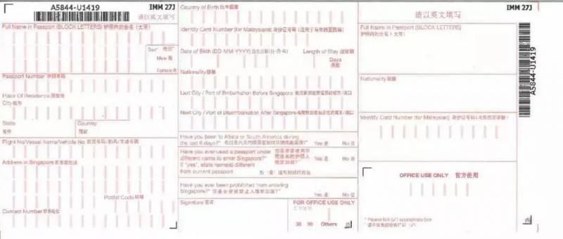 抵达新加坡之前,空乘人员通常会向旅客发放《入境旅客登记卡》,持有留学签证或旅游签证都需要填写。入境卡如下: