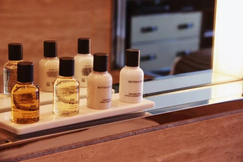 备品是主打低调奢华的BV,和酒店整体的气质还挺搭。没错,就是易烊千玺代言的那个意大利奢侈品牌Bottega Veneta。