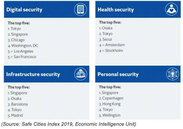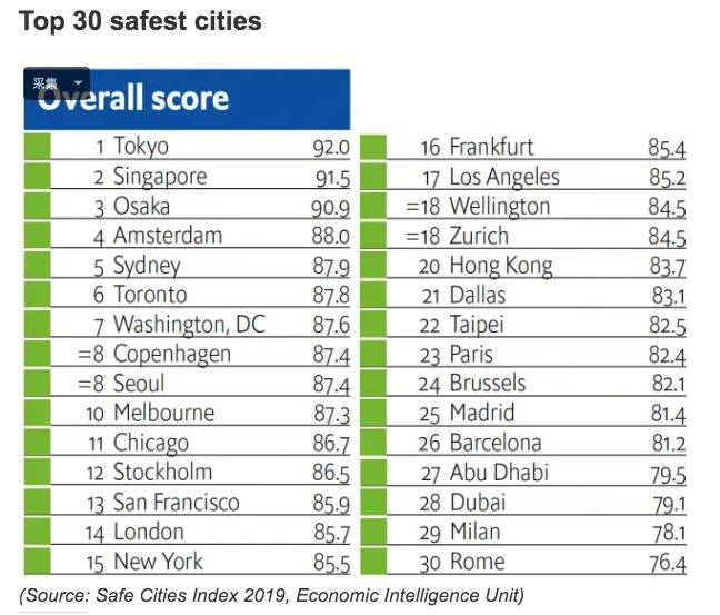 最新一期的经济学人智库全球安全城市指数中,