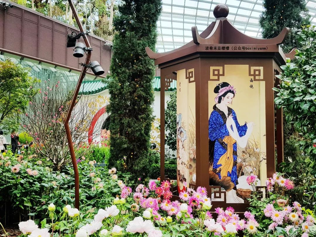 中国古代四大美女装饰在大型走马灯上,新加坡原本有一个地方想用四大美女之一来命名,但可能觉得用谁不用谁都不太合适吧,干脆直接叫Simei四美!