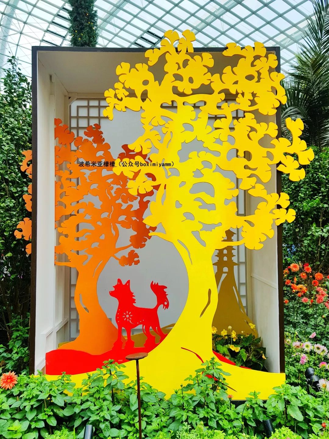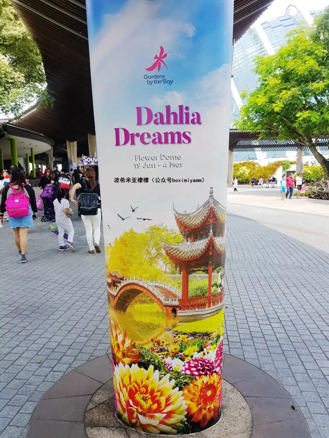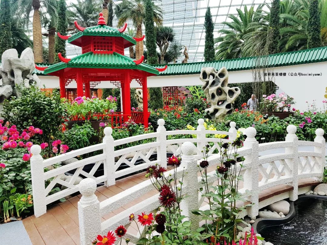 新加坡滨海湾花园的花穹,在春节期间应景的换上了喜庆迎春的新花展,Dahlia Dreams,大丽花之梦,总共展出了3000盆,30种大丽花。今年的设计灵感来自古典庭院,小桥流水,曲径通幽,每天傍晚六点到九点,画作屏幕还会播放全息影像,这是一个全新的体验。