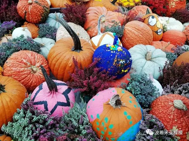 五颜六色奇形怪状的南瓜干点嘛?做成万圣节的南瓜灯,并且画上许多小鬼脸,那颗有斑点的南瓜,是不是草间弥生奶奶画的?