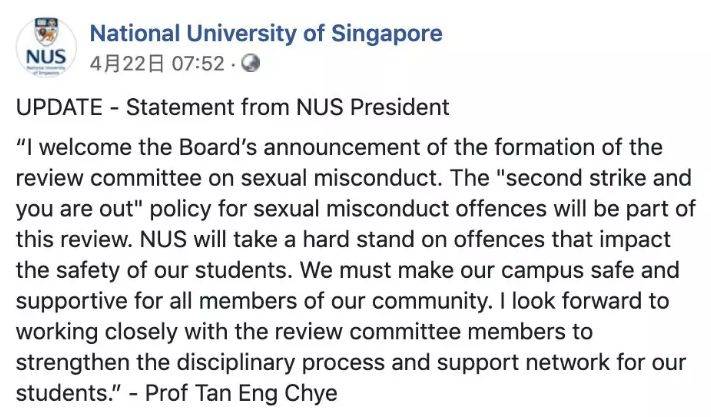 4月23日,新加坡国大校长陈永财教授终于站出来道歉,坦言校方从一开始就没给予女生足够协助。国大也对女生投诉无门,竟然需要通过社交媒体表达担忧,才引起学校的关注表达歉意。