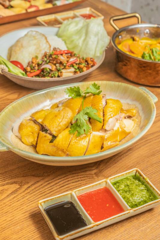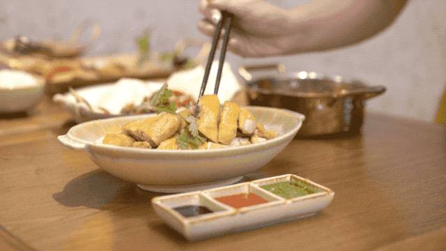 甄选的文昌白切鸡,在严控火候的滚水中翻滚而出,保持了鸡肉本身的鲜美。在金黄的外皮下,鲜嫩的白肉仍然多汁,不蘸酱料能吃出丝丝入扣香油味和食材本身的风味,配上酱料则能同时享受三种不同的味道。