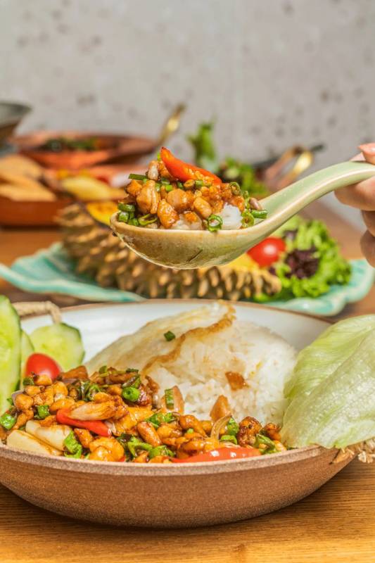 香料不仅能作为调味存在,在新加坡,植物香料可以直接成为主菜。这碗看似普通的主食,实际上是用塔抛叶与肉末炒制而成。