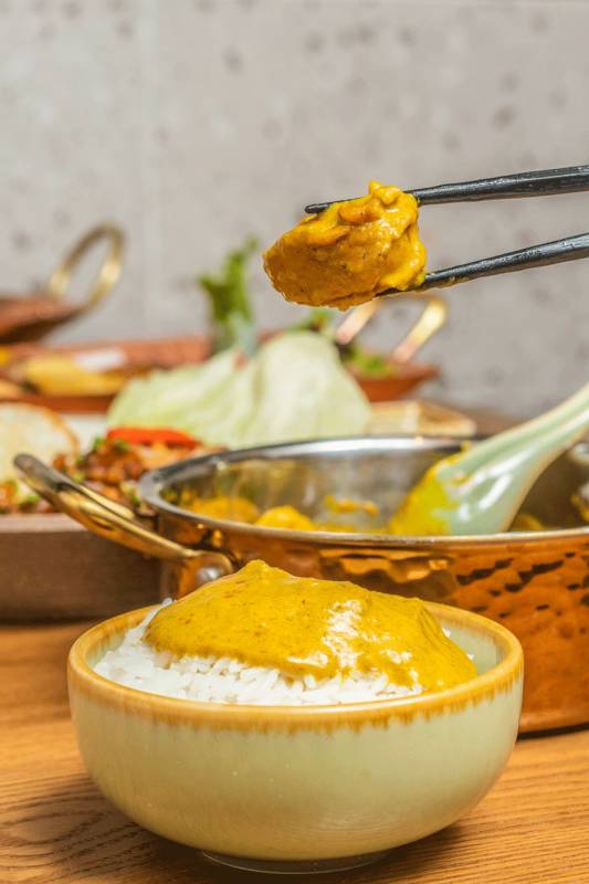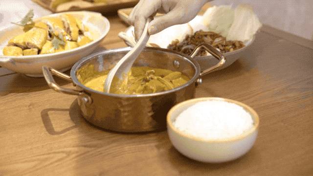 不同于印度和日本咖喱,南洋咖喱是用咖喱胆调制而成,味道更浓郁,除了香料的味道,还有一丝甜味在其中萦绕,带着微微的辛辣,将一块块鲜嫩鸡腿肉包裹,恰如南部的阳光般治愈人心。