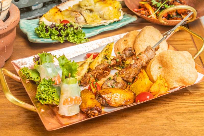 新加坡菜品太多什么都想尝试,来一份小食拼盘就够了,各种风味烤物一盘应有尽有。新加坡香茅烤肉和南洋鸡翅中肉香浓郁,南洋大虾米纸卷一卷卷万物,清新解腻,泰式美味炸春卷外皮酥脆,内料丰富。