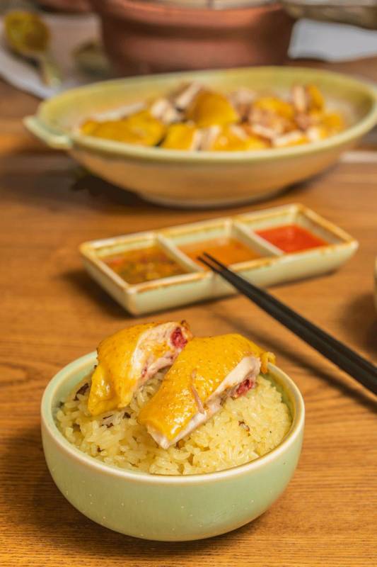摆放在一旁的油鸡饭则是味蕾的小惊喜,被鸡汤蒸煮而成的米饭粒粒分明,每一颗都吸收了文昌鸡的精华,细细品尝还有蒜蓉的香味,用来搭配海南鸡再好不过,单独吃一碗饭同样有滋有味。