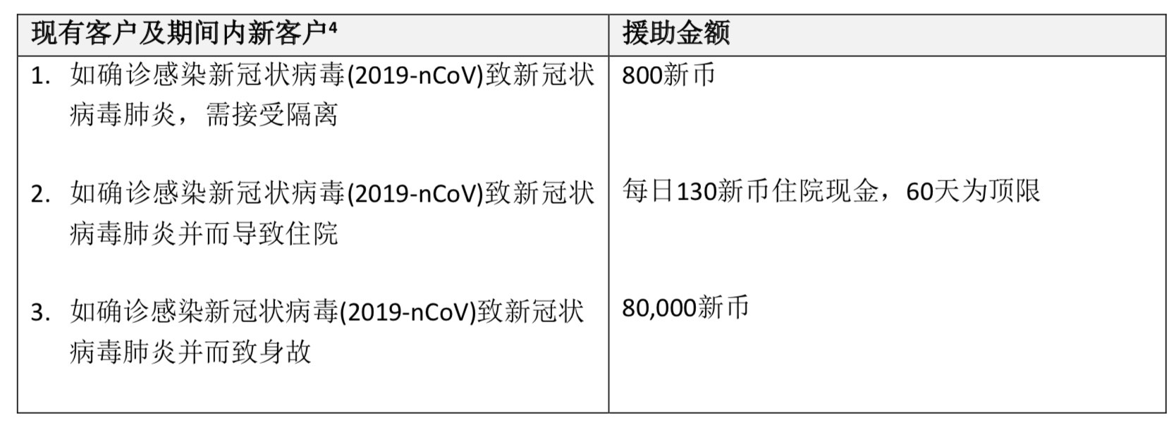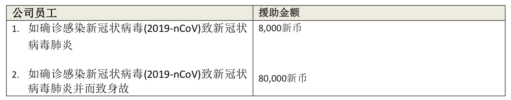 备注: 1. 88,600 新币是根据客户援助方案下,所有三项援助项目的总额,其中假设住院天数是 60 天。 2. 若员工也是公司客户,则按照员工方案进行捐赠。 3. 该援助活动将在以下情况下结束:(i)新加坡政府宣布新冠病毒爆发不再对健康构成威胁的 30 天后; (ii)2020 年 8 月 31 日; 或(iii)在两项方案下所支出的援助总额达到了 620,000 新币,以最早的为准。 4. 就 2020 年 2 月 10 日起新签发的个人保单,于保单签发日或保单生效日(以较后者为准)后的 14 天内或之前的已确诊 新型冠状病毒肺炎,或其症状及病征已出现,我们将不会给付任何援助金。