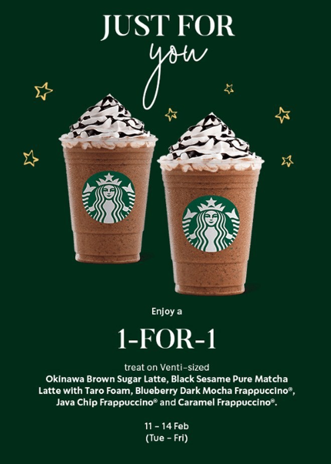 Redeemable when you pay with your Starbucks CardValid from 11 to 14 February 2020 (Tue to Fri) on Venti-Sized Okinawa Brown Sugar Latte (hot, iced or blended), Black Sesame Pure Matcha Latte with Taro Foam (hot or iced), Blueberry Dark Mocha Frappuccino® (blended), Java Chip Frappuccino® (blended) and Caramel Frappuccino® (blended) at all Starbucks Singapore stores (except for stores located at Changi Airport including Jewel)Limited to four vouchers per member, for a one-time use onlyJava Chip Frappuccino® and Caramel Frappuccino® voucher is limited to the same drink redemptionLimited to 1 redemption per transactionOffer is while stocks lastOffer is exclusive to your Starbucks account and is non-transferableNot valid on Mobile Order & Pay, delivery orders or with another other promotions or privilegesOther T&Cs apply