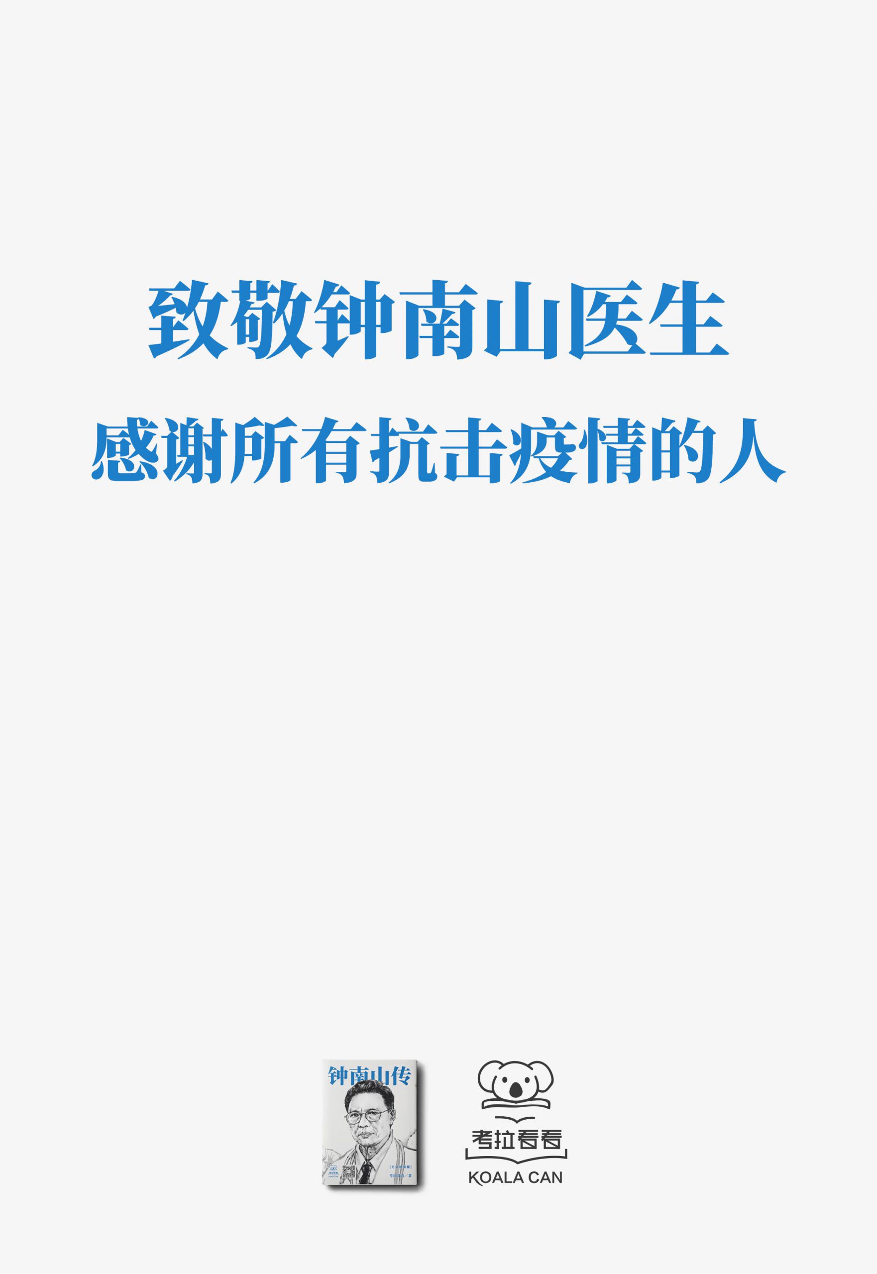 【参考资料】[1] 钟南山.大家.呼吸病学专家钟南山.CCTV10.2019-01-04.[2] 钟南山.谢谢了,我的家.CCTV4.2019-01-12.[3] 钟南山.不老人生•钟南山.CCTV9.2019-10-23.[4] 张先贤.钟南山在抗击“非典”斗争中的重要贡献[J].广西社会主义学院学报,2003:11(14).[5] 贾爱华. 正常体重肥胖相关临床问题研究[D].西安:中国人民解放军空军军医大学,2018.[6] 钟南山.2017年慢性气道疾病防治研究进展[J].华西医学,2018,33(01):1-7.[7] 钟南山院士:灰霾使淮河以北预期寿命缩短[J].中国科技信息,2014(06):14.[8] 张明萌.医者钟南山[J].南方人物周刊.2019-01-18.[9] 蔡敏.什么成就了钟南山[N].中国妇女报.2020-2-10.——————————————————————本文工作团队策划:考拉看看·传记中心特别支持:考拉看看·人文社科中心主编:马 玥原创内容总监:熊玥伽创意总监:康 成审稿人:李开云 姚茂敦撰稿:邓晓凤 李柯薪 祝雪梅 熊玥伽 作文君·蓉小漂团队视觉:汪智昊 书服家·设计中心排版:陈 兰 张 奕图书支持:刘进全 奚文渊 王国宇 何晚婷【本文版权归“考拉看看”所有】