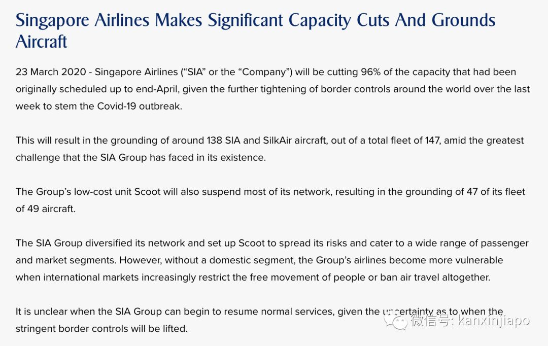 对于新加坡航空公司来说,面临的挑战是史无前例的。新航和胜安航空共147架飞机中有138架停飞,只有9架飞机运行;酷航的49架飞机则仅剩两架会继续运作。