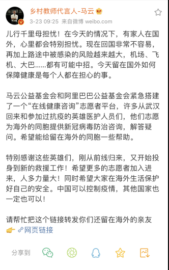 “马云公益基金会和阿里巴巴公益基金会紧急搭建了一个‘在线健康咨询’志愿者平台,许多从武汉回来和参加过抗疫的英雄医护人员们,他们志愿为海外的同胞提供新冠病毒防治咨询,解答疑问。希望能给留在海外的同胞一些帮助。特别感谢这些英雄们,刚从前线归来,又开始投身到新的救援工作!希望更多的志愿者加入进来,人多力量大!”马云在其个人微博账号上表示。