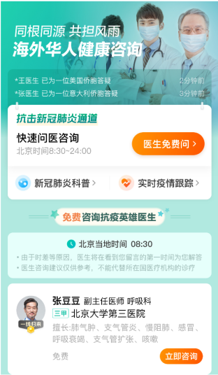 从3月8日起,身在海外的你,只要在下载支付宝,并在首页搜索“科学防疫”,点击进入「守护海外华人」阿里健康问医生服务页面,点击“全科医生免费问”,即可在北京时间 8:30-24:00 免费咨询国内医生。至今,已有数十万名海外华人使用该服务,医生日接待咨询量比上周增长逾三倍。