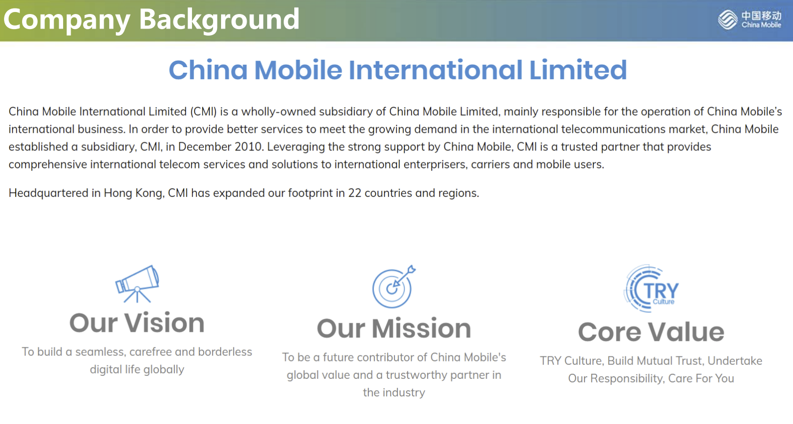 China Mobile International Limited (CMI) is a wholly owned subsidiary of China Mobile which is now the largest telecom operator in the world by network scale and subscriber base, and is among the top in terms of market capitalization and brand value. CMI is mainly responsible for the operation of China Mobile’s international business, and has expanded its footprint to 22 global offices around the world. Leveraging the strong support by China Mobile, CMI provides a full range of comprehensive international telecommunications services and solutions to international carriers, enterprisers and mobile users.