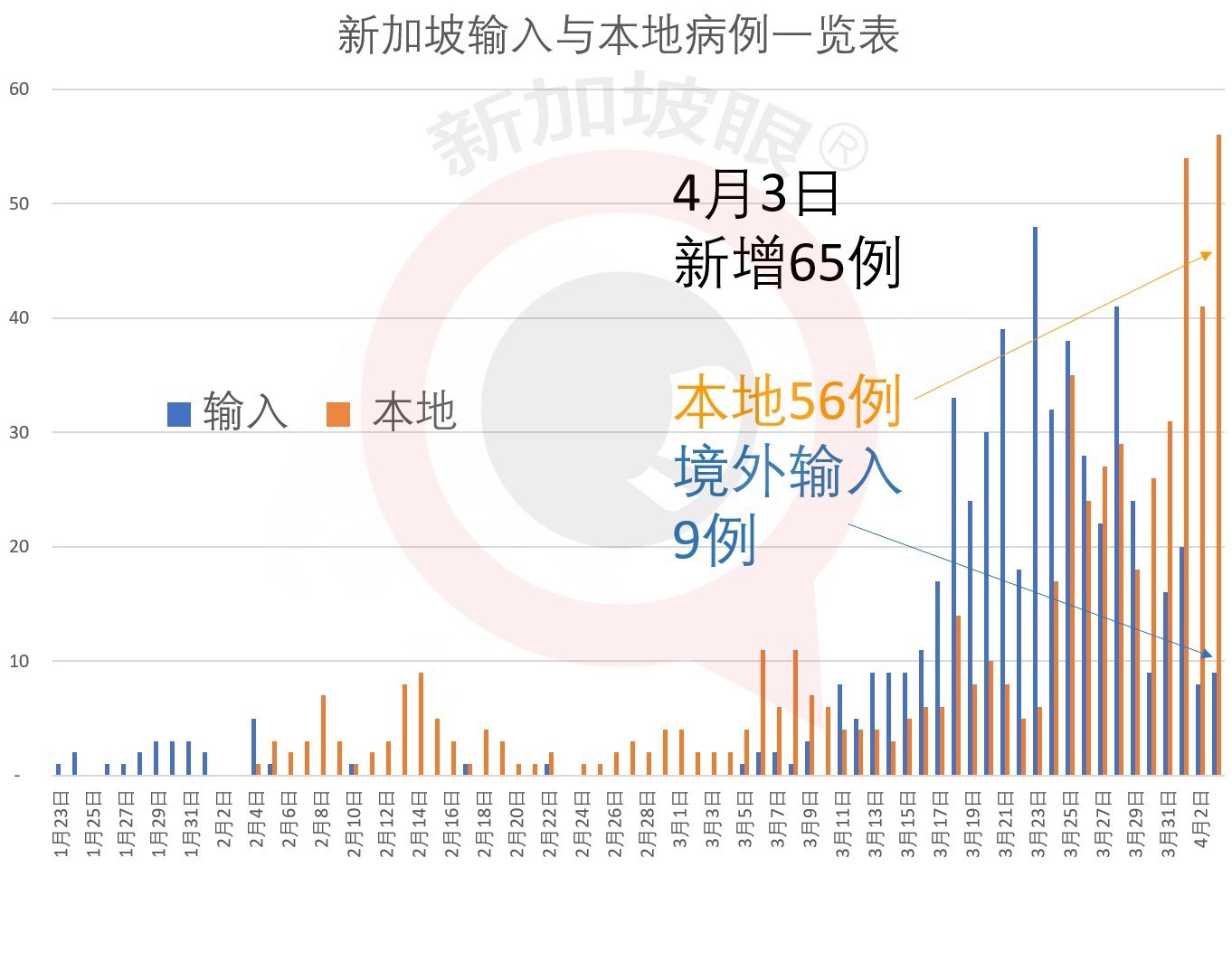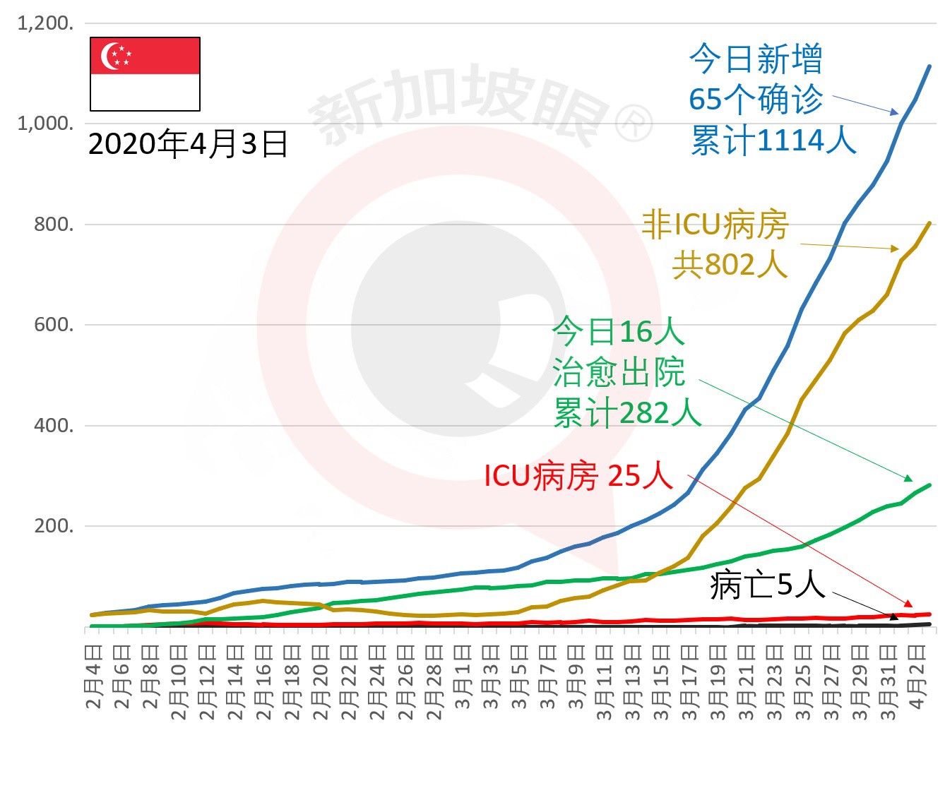 截至今天(4月3日)中午12点,新加坡新增65例新冠肺炎确诊病例,其中9例为境外输入,累计确诊达1114人,累计死亡5人。