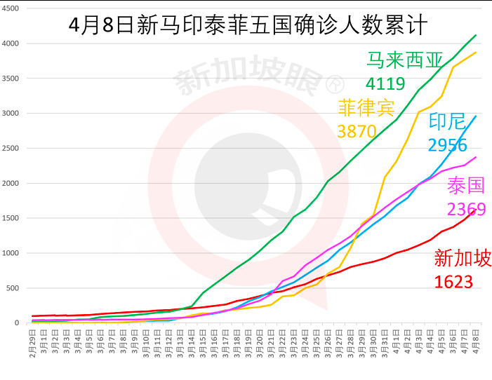 邻国方面,马来西亚今天新增156例,累计4119例。印尼新增218例,累计2956例。菲律宾今增106例,累计3870例。泰国新增111例,累计2369例。
