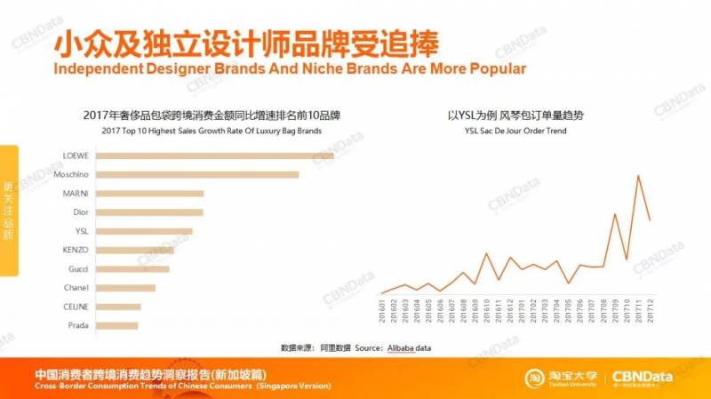 提到追求品质,那必然少不了奢侈品的消费。奢侈品包袋销售额逐年走高。90后逐渐成为奢侈品消费的主力人群,这些追求个性的年轻人对于奢侈品包袋的认知也不再仅局限于LV、Gucci 等,对LOEWE、Moschino等低调小众的品牌更感兴趣。