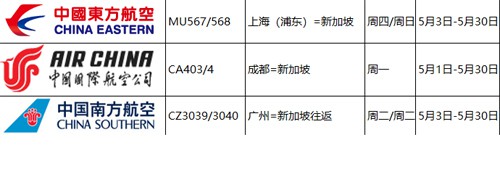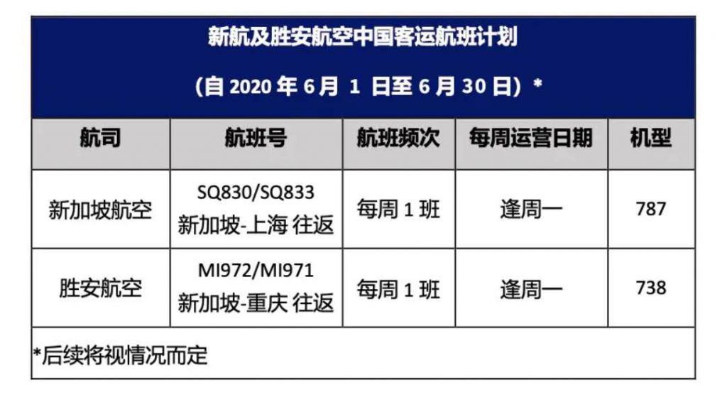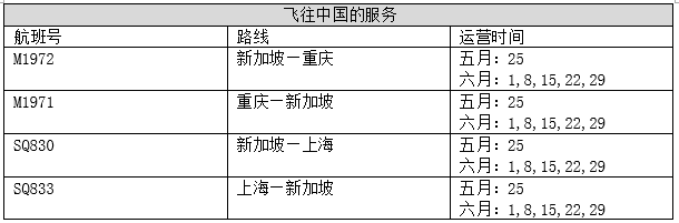 经相关审批通过后,6月1日-6月30日期间,新加坡航空及胜安航空将分别继续保留每周一上海往返新加坡的一个航班及每周一重庆往返新加坡的一个航班。