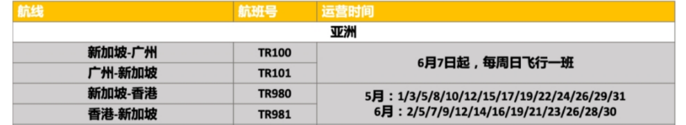 另外,酷航回来了!随着出入境限制渐渐放宽,酷航开始飞往中国,以下是酷航5月至6月飞往中国的航班:
