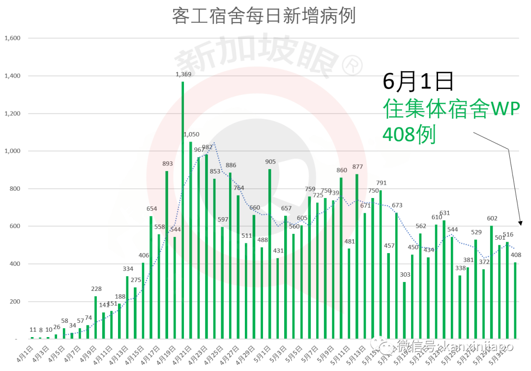 新加坡6月1日追查到3个新感染群,全是位于工业区的客工宿舍。情况如下:1. 位于丹那美拉海岸路(Tanah Merah Coast Road)33A号的HSJV客工宿舍:新确诊的4人与先前确诊的163人证实互相关联,形成本感染群,一共167人。2. 位于大士南12街(Tuas South Street 12)10号的客工宿舍:先前确诊的3人证实互相关联,形成本感染群,一共3人。3. 位于大士景1径(Tuas View Walk 1)109号的客工宿舍:先前确诊的7人证实互相关联,形成本感染群,一共7人。客工宿舍病例住在大型集体宿舍和工厂改建宿舍的客工(WP)新增确诊408例。