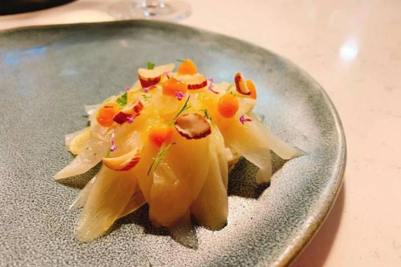 白芦笋切成薄片摆成一朵白莲花的形状,创意刀工都赞。下面用白蟹肉和沙拉酱打底,吃起来口味清新,上面撒上切成小片的杏仁,别有风味。