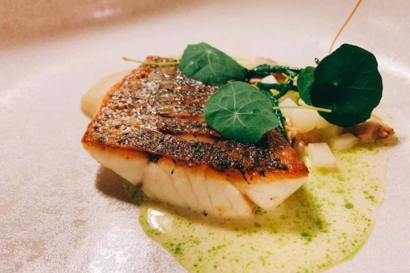选取了海鲈鱼最好的一段,用文火煎熟。西餐中的食材,很少会像中餐那样先经过一道腌制上味的过程,大部分都要体现食材原本的味道,然后用酱汁来调和。