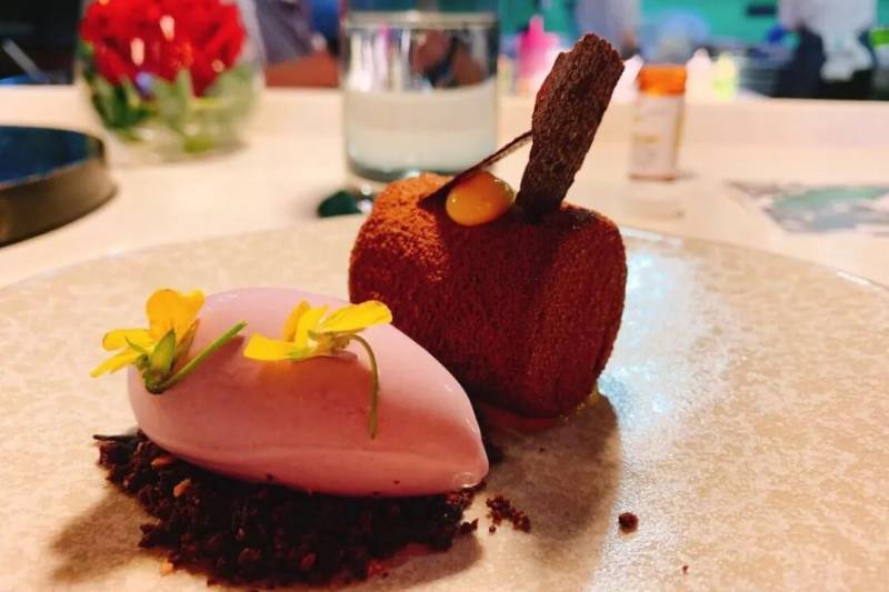 百香果混了紫罗兰的冰淇淋,口感绵密,色彩亮眼,下面用昆布碎垫底,中和了巧克力的甜而带出了savory, 用心巧妙,值得给颗星星。