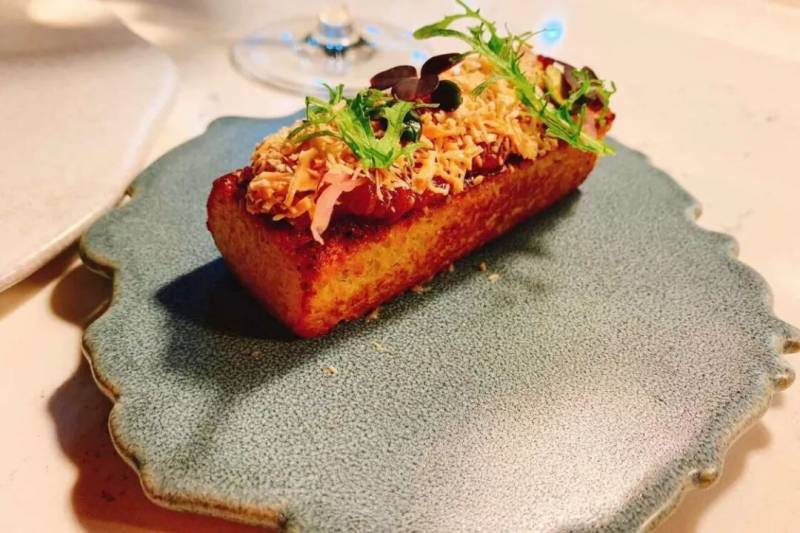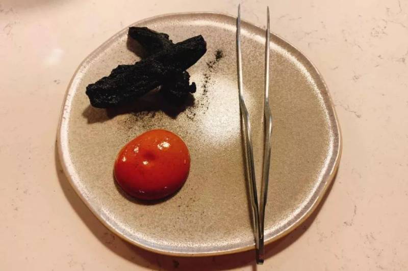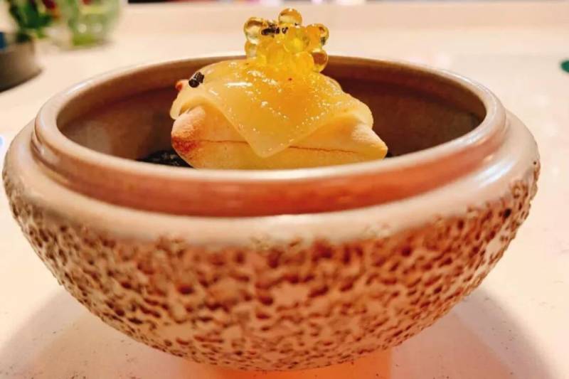 第四道零食,是用面烘焙了一个类似小泡芙的壳,里面挤满了沙拉酱,上面盖了一小片奶酪并点缀了金黄色阿尔玛斯鱼子酱,这可是超过100岁白鲟鱼的鱼子,值回票价了,哪怕前面多吃几根碳也值了。