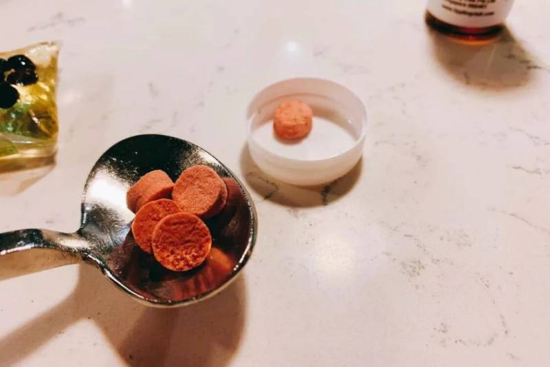 来!吃药。原来是制成药片形状的奶!酪!蛋!糕!OMG!这也太好玩了吧!吃到现在,才感觉到主厨的卖萌哦,天,爱死了!