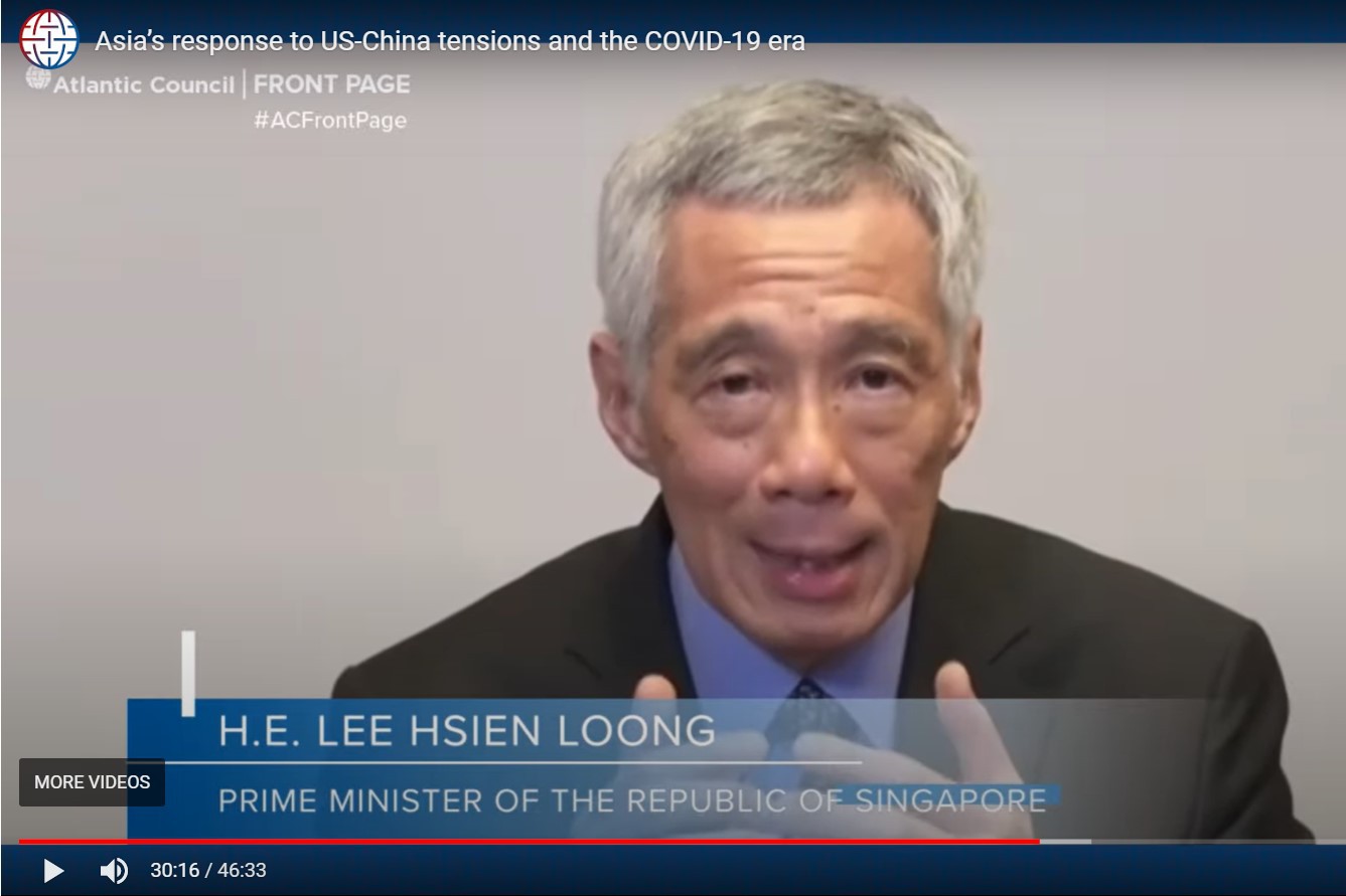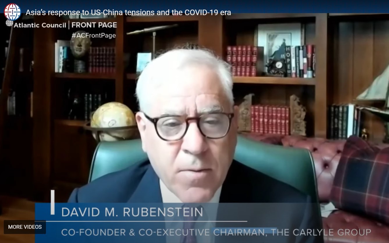 7月28日,总理李显龙通过视讯参加华盛顿智库大西洋理事会(Atlantic Council)举办的座谈会。主持人是凯雷投资集团联席执行董事长鲁宾斯坦(David Rubenstein)。