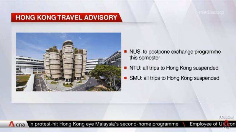 CNA报道,新加坡国立大学(NUS)、南洋理工大学(NTU)、新加坡管理大学(SMU)都取消了学生去香港交流的计划。