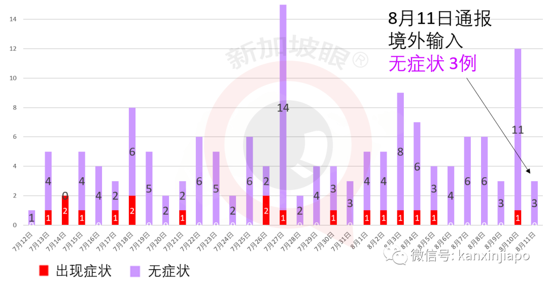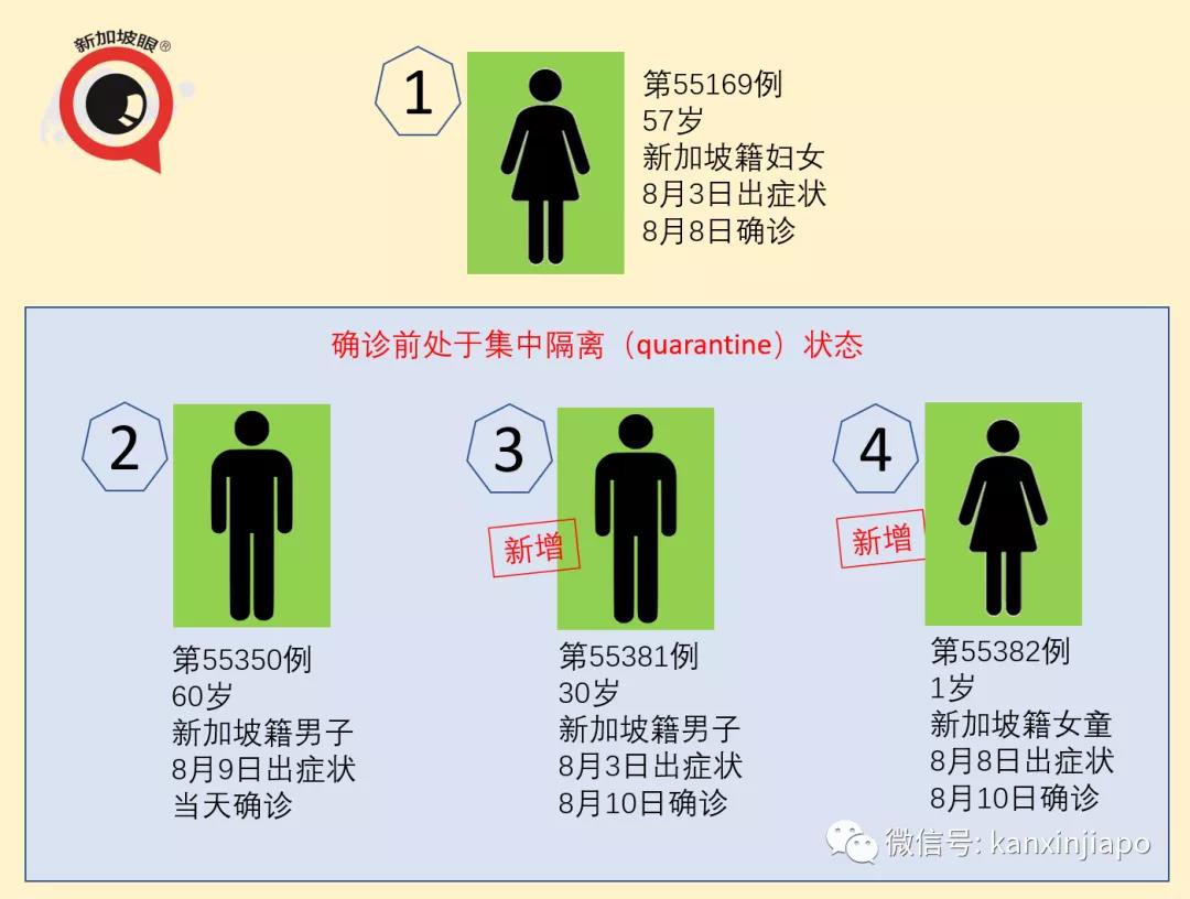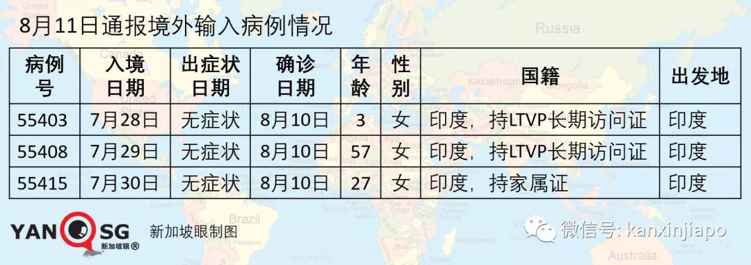 8月11日,新加坡新增确诊61例(累计55353例),含境外输入病例3起、社区病例2起、客工宿舍病例56起。昨日通报的3起境外输入病例,全为无症状,从印度输入,全在指定地点执行“居家通知SHN”时确诊。
