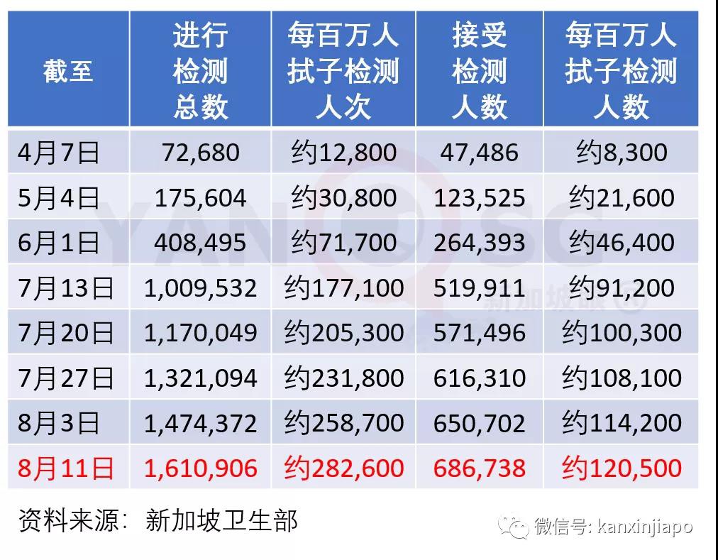 截至8月11日,新加坡一共进行了161万人次检测,接受检测人数68万人,每百万人口检测人次为28万人次。
