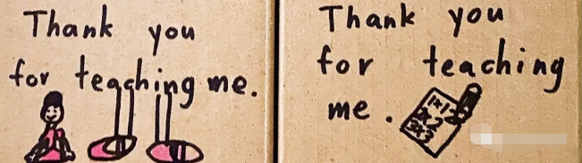 芝麻今年在饼干盒上写了“谢谢您教导我”,然后配图,比如上面是给(校外兴趣班的)芭蕾舞老师和珠心算老师的。