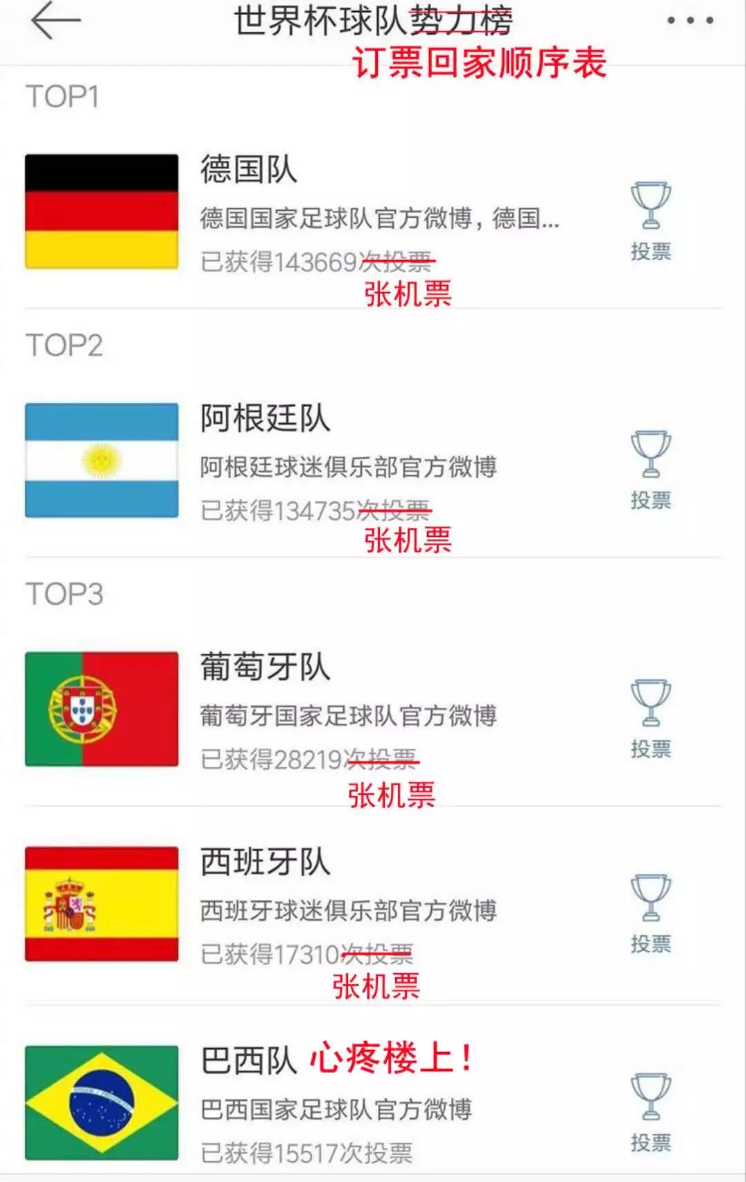 赛前大家理性开始投世界杯球队势力榜,后来发现硬生生变成了订票回家顺序榜。
