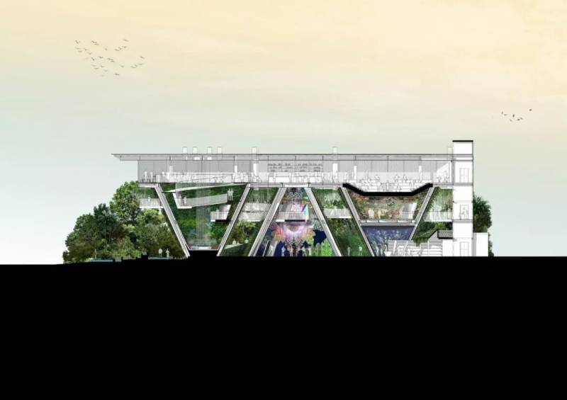 从展馆建筑图中可以清晰看出这三个被太阳能顶棚遮挡的圆锥体。当游客在这些元素之间穿梭时,他们会体验到许多有趣的空间内容