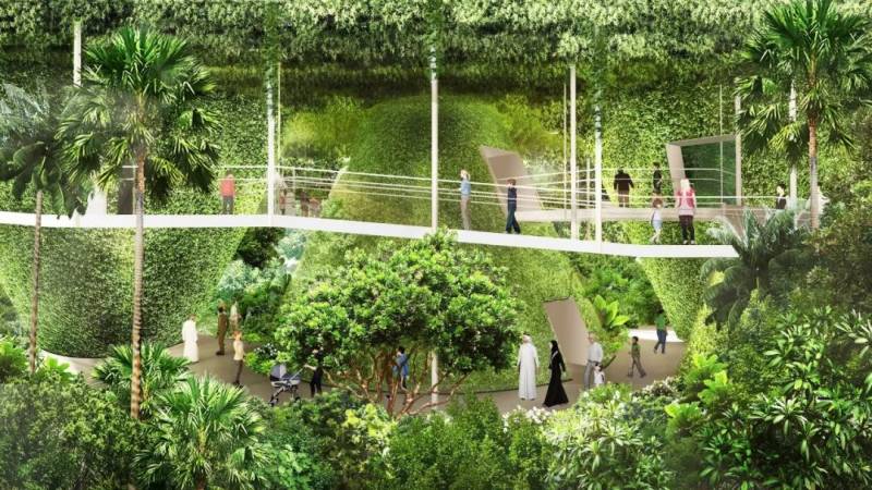 展馆的设计主旨是在阿拉伯沙漠中创造出一片绿洲,我们不仅最大化利用了展馆的可用区域,还通过堆叠层成倍增加了使用面积,形成了一个巨大的立体绿色空间。地面是一片由热带树木、翠绿灌木和生机勃勃的兰花组成的葱郁绿洲,顶部是由三个锥状垂直绿化固定的壮丽空中花园。