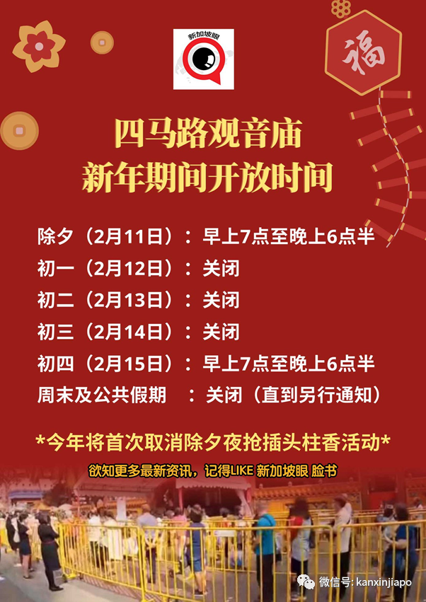 新加坡四马路观音堂开放时间早前,为了防止群聚,今年农历新年四马路观音堂首次取消抢头香活动!但观音堂仍然会在除夕当天开放给公众。