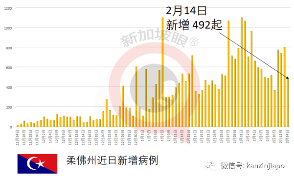 最靠近新加坡的柔佛新增492起,占当天确诊人数的20%;近日柔佛病例数据如下: