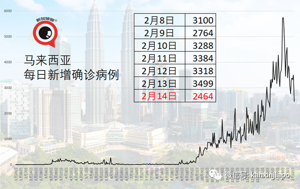 2月14日,马来西亚新增2464起确诊病例,六天内第二次降至“2”字头,也是1月11日以来的单日新低。马来西亚累计确诊26万4269起。
