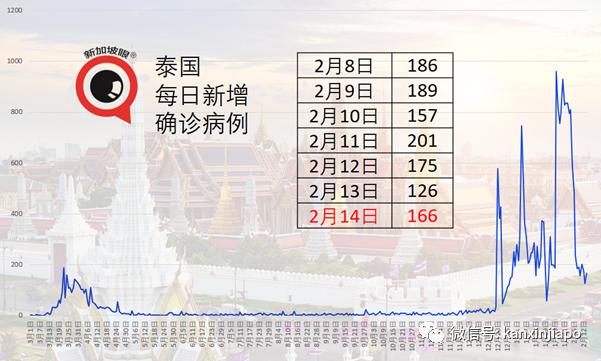 过去七天,一共101人确诊,其中48起(47%)为既往感染,26起(26%)为新近感染,其他27起(27%)检测结果未出。 昨天17人病愈仍有1人在ICU重症病房 2月14日,新加坡卫生部通报:17人病愈出院,累计病愈5万9621人;现有病患为150人,比前天减3人。 现有病患包括:中症病房有31人,比前天减2人;118人在社区护理设施或社区康复设施,比前天减1人。 ICU重症加护病房有1人,于2月5日进入ICU,已有10天。 新加坡死亡病例累计29起,上一次通报死亡病例是11月28日。 泰国新增166起确诊病例巴吞他尼府病例人数上升