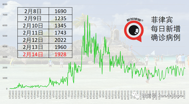 2月14日,印尼新增6765起确诊病例,累计121万7468起。 这是印尼连续七天降至日增万起以下,也是印尼自1月4日以来的单日新低。 同日,通报247起新增死亡病例,累计3万3183起。 从图表上看,无论从新增确诊病例人数或新增死亡人数看,印尼疫情仍持续中,但近一两周似乎达到峰值,似乎已见拐点。 印尼新冠确诊病例和死亡病例人数皆为东南亚最高。 菲律宾新增1928起确诊