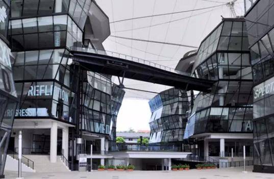 学院由新加坡本土的RSP建筑公司设计。整个建筑以玻璃和金属为主要材料。每层平面都是不规则多边形轮廓,且上下层轮廓线都不重叠,这样的设计使得整个校区的每层楼都倾斜往不同的角度,极富视觉冲击力。在每座建筑之间有“人行天桥”相连,让人在校园内能四通八达。此外,一张巨大的塑料膜覆蓋在每座建筑的楼顶,这种膜材料和玻璃幕墙的应用,保证了每座建筑的采光。