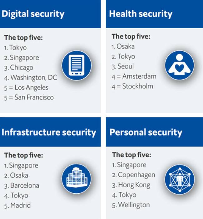 以数码、卫生、个人及基础建设安全作为评分范围,调查对象包括全球60个城市。涵盖了57项不同因素。