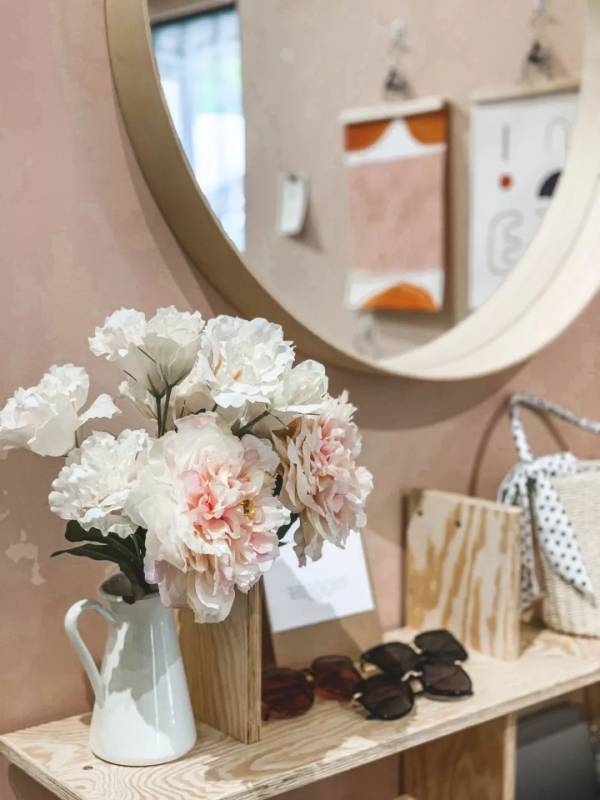 店内的整体风格很夏日,却并非色彩浓重的东南亚风情,而是走寡淡清新的韩风。面积不大的上下两层,除了衣服饰品外,还在一楼留有冷饮台,二楼售卖鲜花及乾花。
