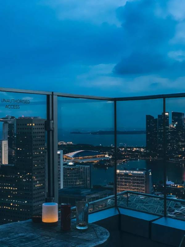 酒吧就在Parkview Museum对面标志性蜂窝建筑的顶楼。新加坡的落日时间是7点左右,建议6:30上天台,如此便可在短短一个小时内饱览白天、日落跟夜晚的景色。