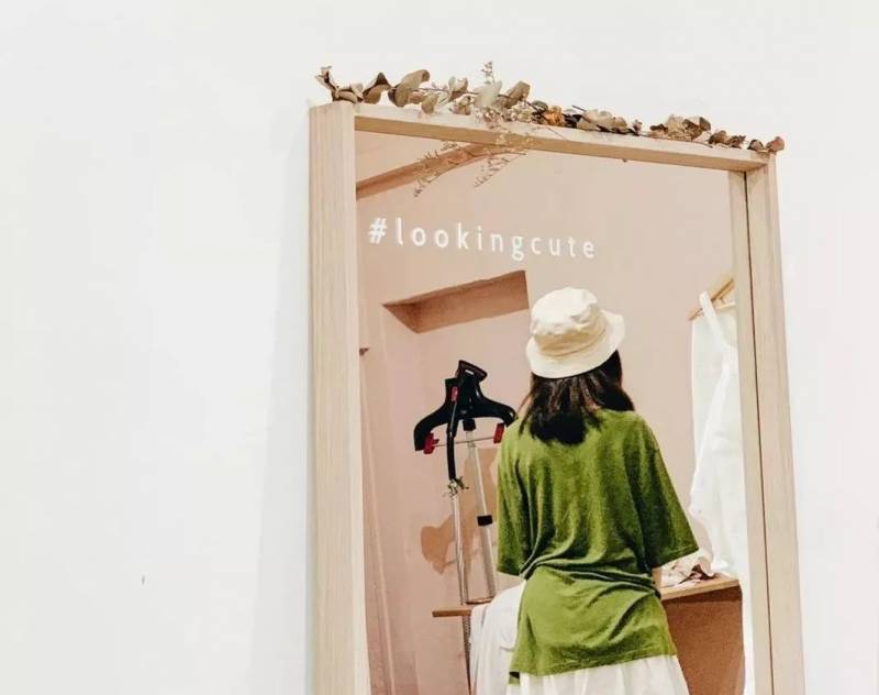 最戳心的还是镜子上那句 lookingcute 的标语,仿佛把女孩子身着漂亮衣服,站在镜子前的想法完美表达了出来。